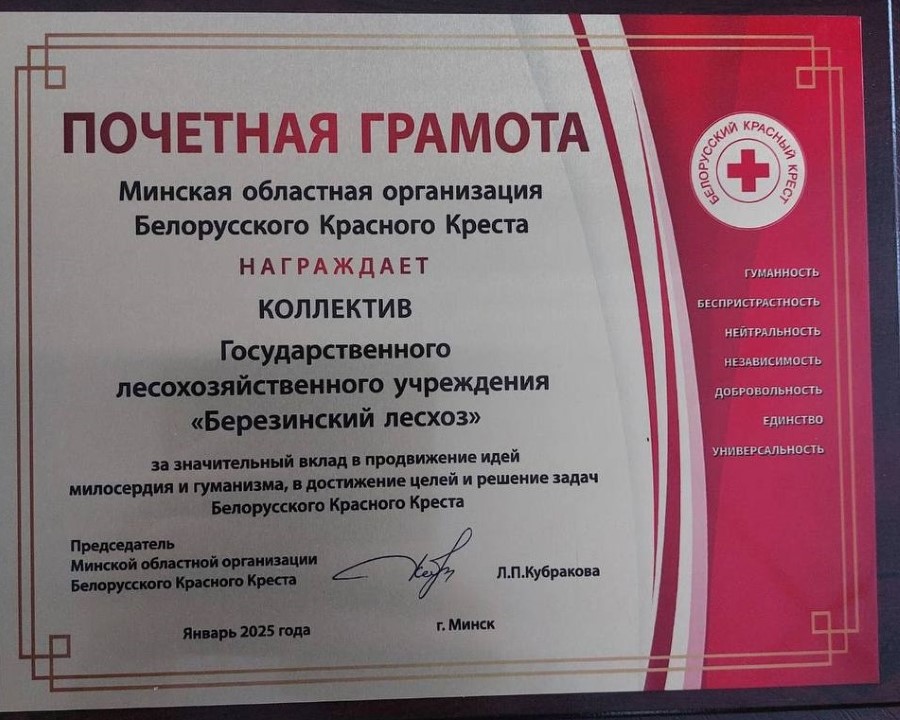 Минской областной организацией Белорусского Красного Креста награжден Почётной грамотой за активную деятельность и значительный вклад в продвижение идей милосердия и гуманизма, в достижение целей и решение задач Белорусского Красного Креста коллектив Березинского лесхоза и директор Сергей Владимирович Чемко