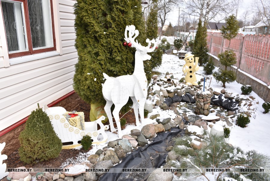 Удивили и гномики, что расположились на стенах дома. Они сделаны из еловых лапок, в красных колпаках, с круглыми носами из новогодних красных шариков, а их бороды из льноволокна – и один, и другой сидят на качелях и держат в руках фонарики с сердечками.