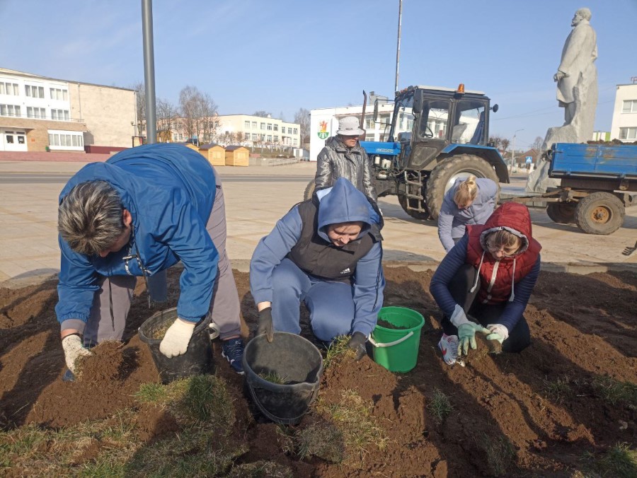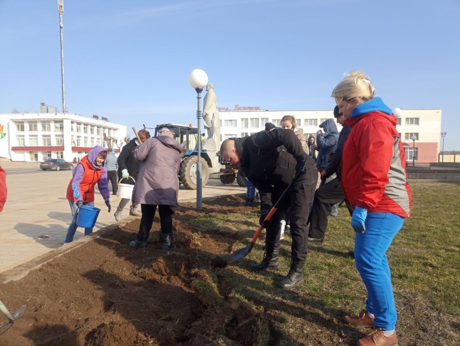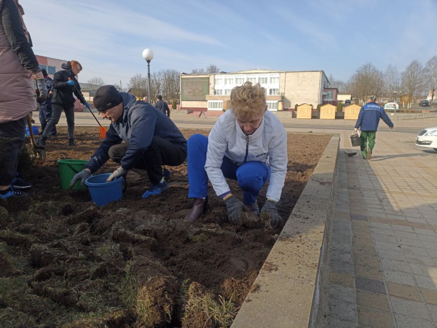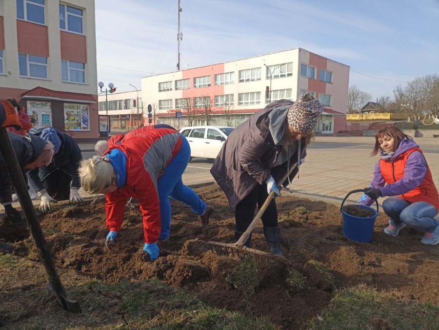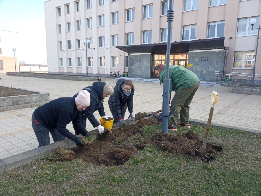 Работники отделов райисполкома и учреждений находящиеся в здании райисполкома благоустраивают клумбы, расположенные на центральной площади города - перекапывают их для последующего посева газонной травы