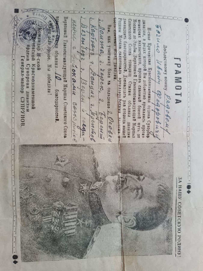 У Вялікую Айчынную вайну ён служыў сапёрам. І ў яго ніколі не было ранення. Можа, з-за падоранага крыжа? Аднойчы яго таварышы падарваліся на міне, а ён цудам уратаваўся, проста прамарудзіўшы. За баявыя заслугі іх дывізія была ўзнагшароджана лістом ад Сталіна за ўзяцце дванаццаці ўмацаваных гарадоў і злучэнне з войскамі саюзнікаў на Эльбе.