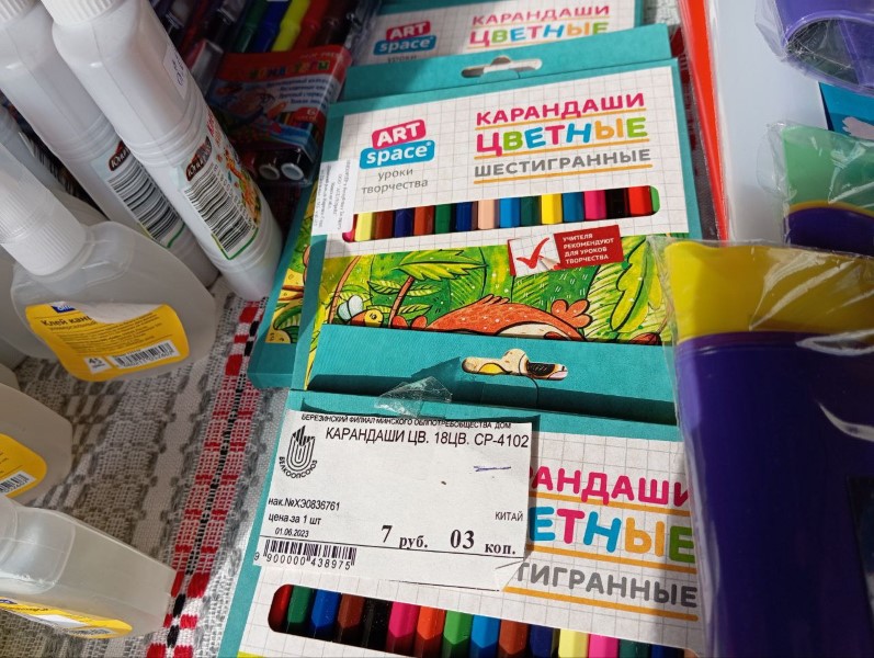 Традиционно начнём с локации универмага. Здесь было представлено всё: от карандашей, ручек, альбомов для рисования до школьных костюмов, рубашек, джемперов, обуви. Всё по вполне приемлемым ценам. Здесь также представлены наборы универсальных обложек для тетрадей и учебников от 1-го класса и выше, выбор цветной бумаги, белого картона. Набор цветных шестигранных карандашей (в коробке 16 штук) можно было купить за 7 руб. 3 коп., обыкновенную линейку – за 1 руб. 61 коп.