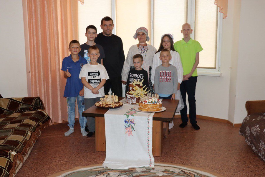 Алеся Алексеевна поздравила семью родителей-воспитателей Ивана Тишкина и Натальи Арех, которые воспитывают 8 детей, с праздником Дожинок и вручила караваи.