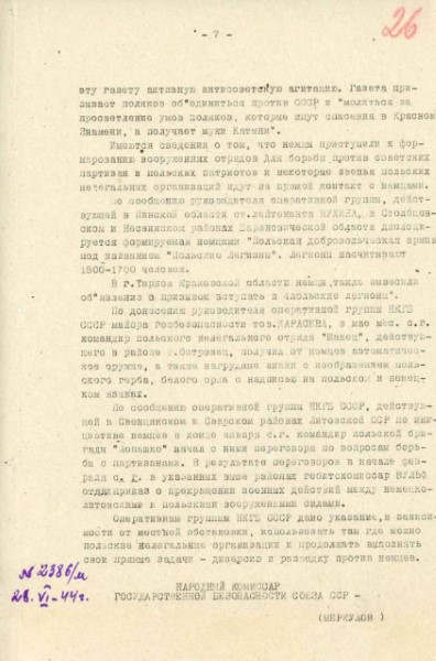 В конце июня 1944 года народный комиссар госбезопасности СССР Всеволод Меркулов докладывал в Государственный комитет обороны о ситуации, складывающейся внутри "Армии Крайовой", контактах "аковцев" с гитлеровскими оккупантами и формировании германским командованием так называемых "Польских легионов".