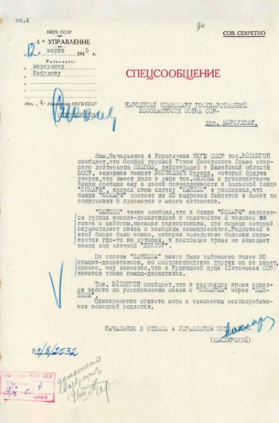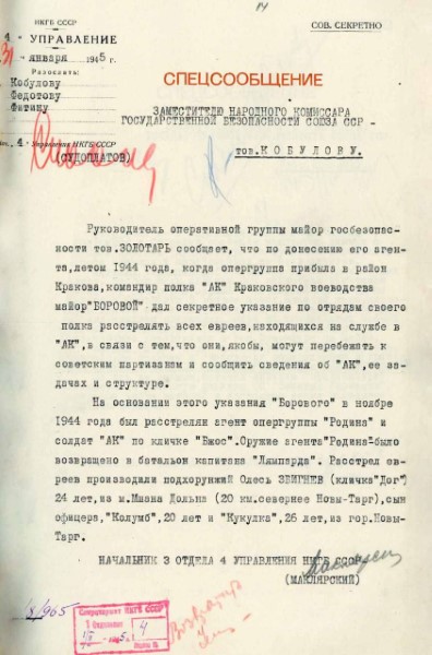 Так, 12 марта 1945 года начальник четвертого управления НКГБ СССР Павел Судоплатов доложил Меркулову сведения, полученные от командира зафронтовой Особой группы НКГБ старшего лейтенанта Александра Шихова, действовавшего в Виленской области: