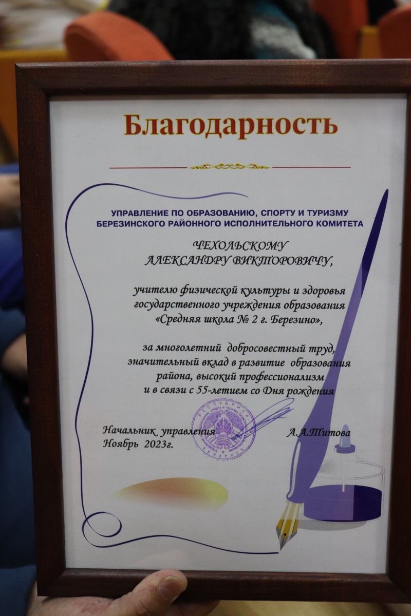 Подводя итоги мероприятия Карина Макаревич напомнила всем о ещё одном важном событии – юбилее учителя физической культуры и здоровья Александра Викторовича Чехольского. С тёплыми словами поздравлений Карина Гарегиновна вручила юбиляру Благодарность управления по образованию, спорту и туризму Березинского райисполкома за многолетний добросовестный труд, значительный вклад в развитие образования района, высокий профессионализм и в связи с 55-летием со дня рождения.