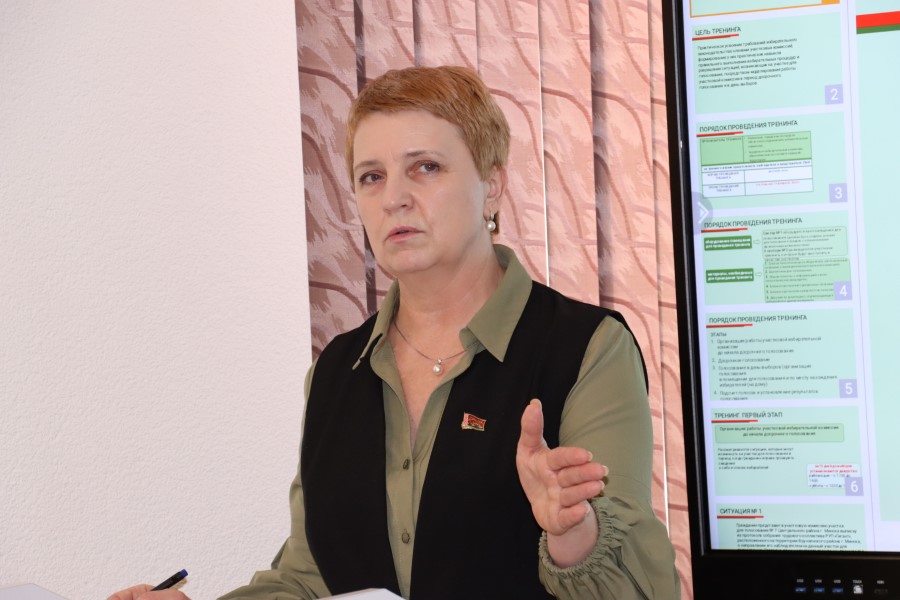Были рассмотрены нюансы работы комиссий в день выборов и досрочного голосования, в том числе алгоритмы действий членов и председателей участковых избирательных комиссий при определенных ситуациях, оформление участков для голосования и другое. Для рассмотрения были предложены наиболее типичные ситуации, которые могут возникнуть во время проведения выборов. Во время тренинга были использованы материалы Центризбиркома Республики Беларусь.