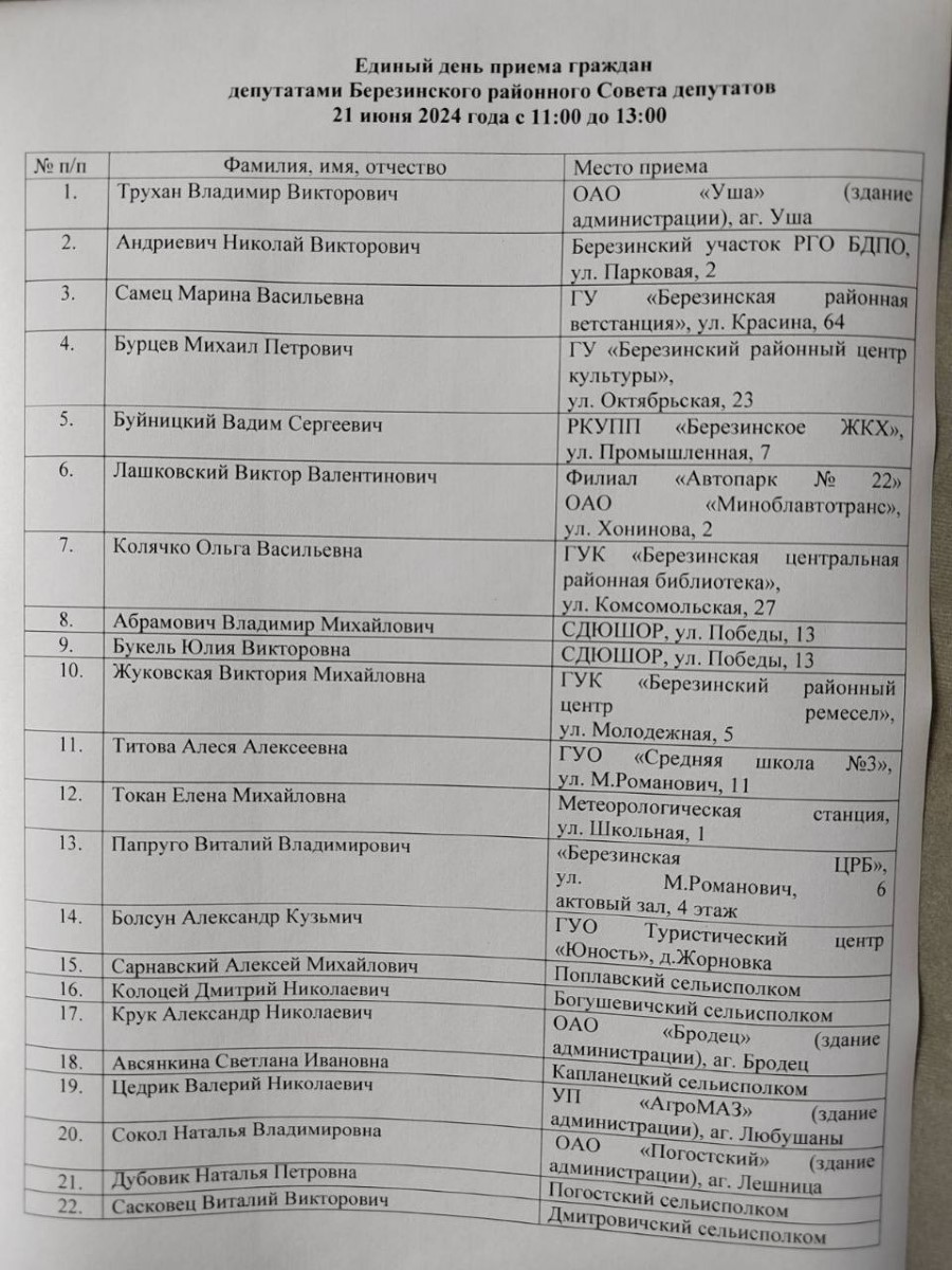 Депутаты Березинского районного Совета депутатов проведут приём на территории своих избирательных округов с 11:00 до 13:00.