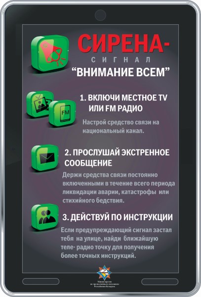 Что же нужно делать в том случае, если вы услышали сигнал «Внимание всем»? Он подается путем включения электрических сирен государственной системы оповещения. Услышав звук сирены – это и есть сигнал «Внимание всем!» – необходимо зайти в ближайшее помещение, настроить радио и телевизор на национальный канал и приготовится к прослушиванию сообщения. Пользуйтесь для этих целей и мобильным телефоном. Вам расскажут, что произошло и как нужно себя вести.