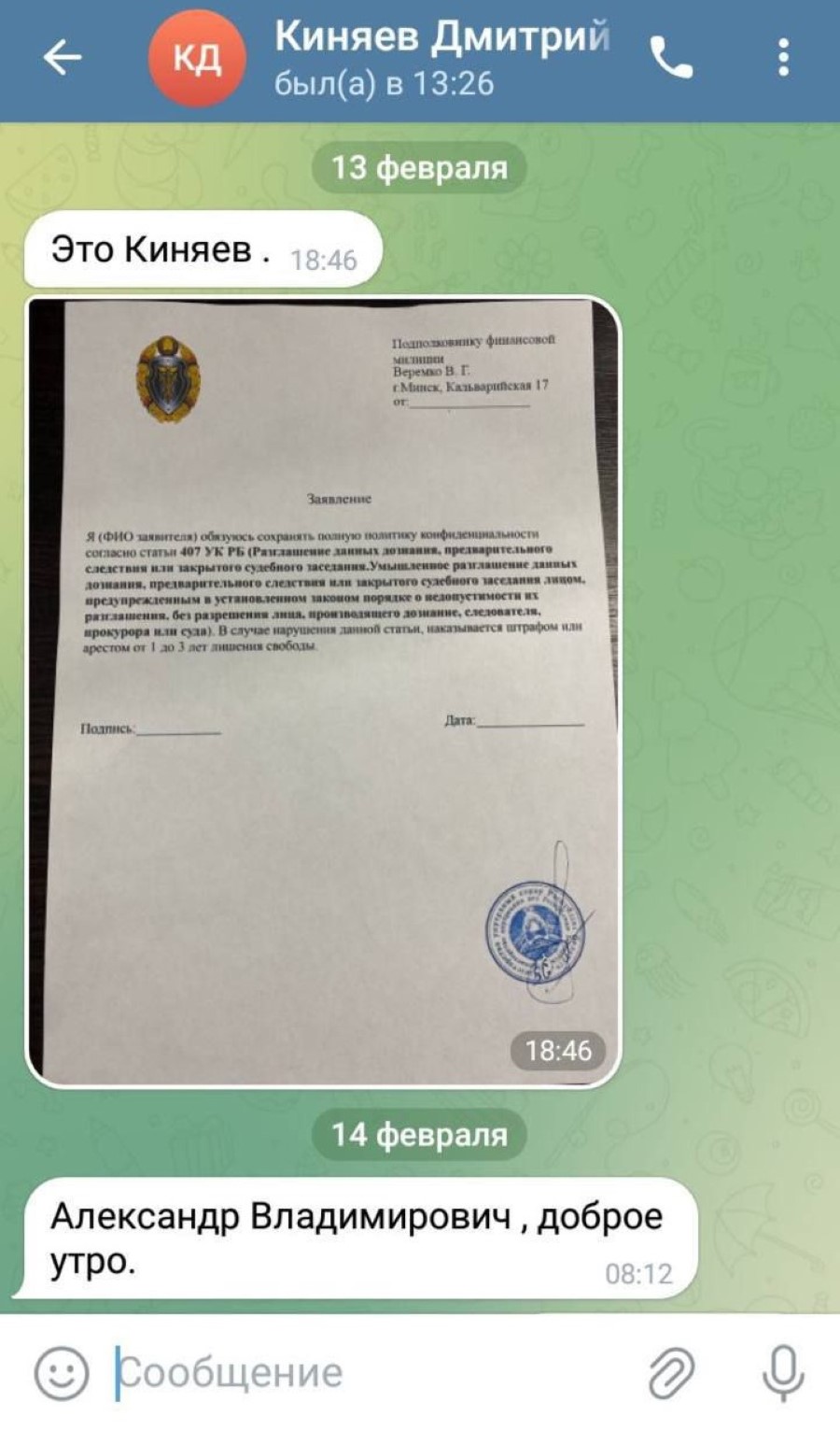 На фото: заявление о неразглашении от потерпевшего и скриншот переписки в мессенджере