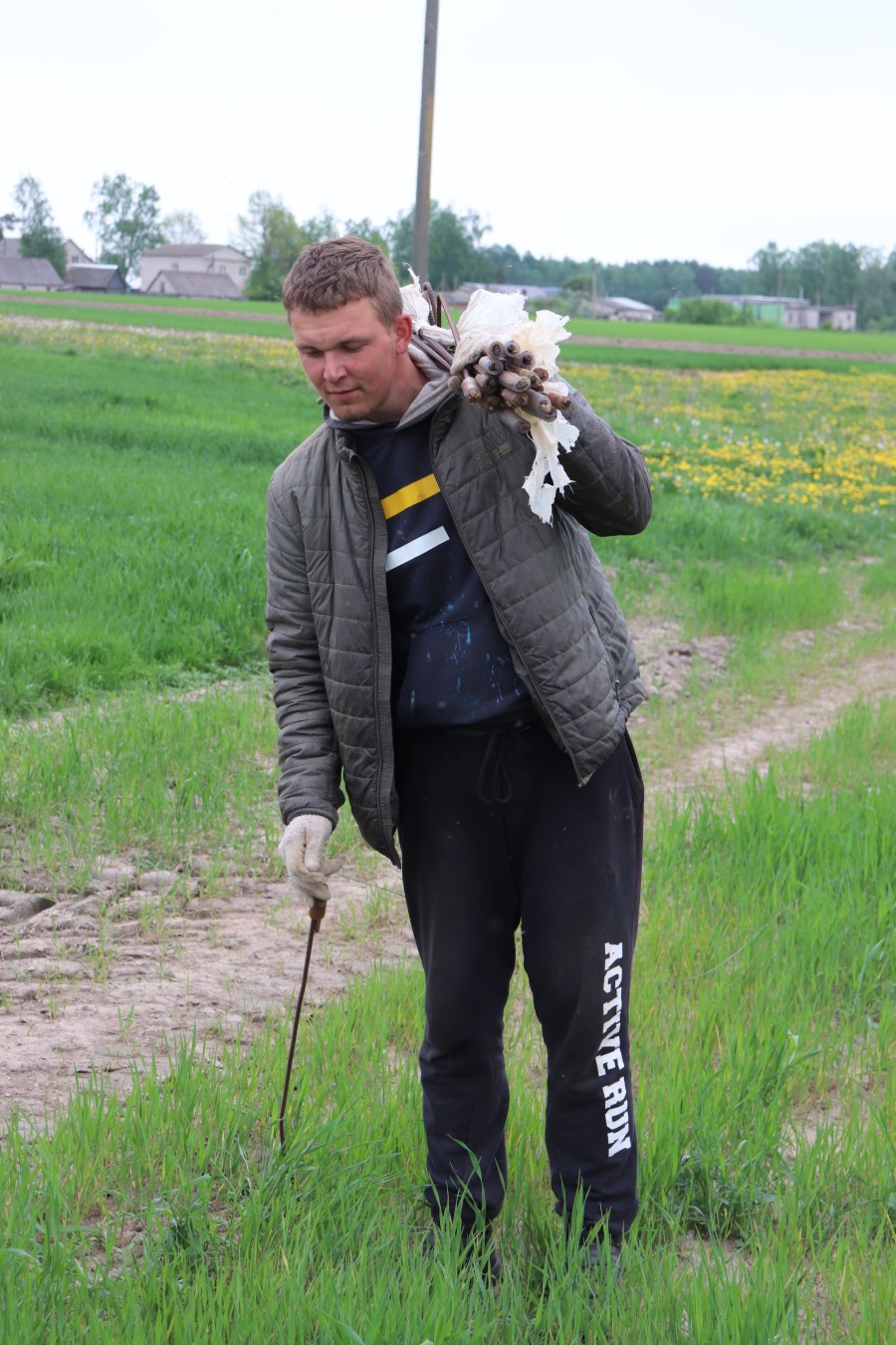 Менавіта за такой работай і засталі мы Мікалая Грыбко: ён крочыў уздоўж скормленага ўчастка і скручваў дрот агароджы, каб затым устанавіць электрапастуха на новым, яшчэ не страўленым, месцы. А з другога боку насустрач яму ішоў Андрэй Малахаў, які збіраў штыры ад агароджы. Дарэчы, Андрэй – брыгадзір паляводчай брыгады, і пакуль адзін з пастухоў знаходзіцца на бальнічным, дапамагае з доглядам жывёлы.