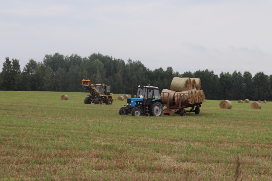 Так, сегодня на сжатом массиве, расположенном недалеко от деревни Городище, велась свозка уже упакованных рулонов соломы и тем самым освобождались площади для дальнейшей обработки земли. В слаженной паре делом были заняты механизаторы сельхозфилиала «Ома» Анатолий Пинчук – погрузчике-«Амкодоре» и Владимир Хохол на тракторе МТЗ со специально приспособленным для перевозки тюков прицепом.