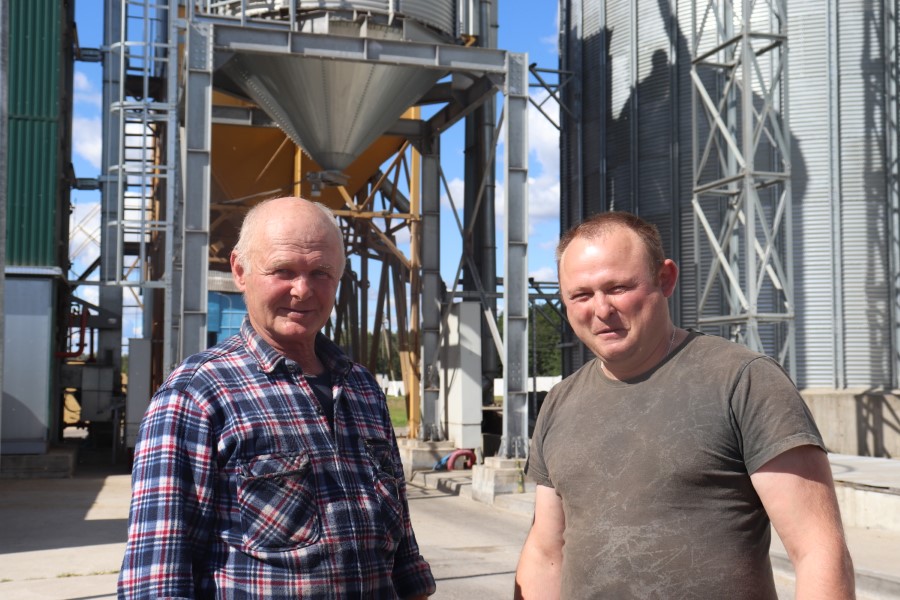 Весь урожай, поступающий с полей, доставляется на доработку на зерносушильный комплекс. Здесь неустанную круглосуточную вахту несет четыре специалиста сельхозпредприятия (по двое в смену) – Александр Карпушкин и Григорий Бохан, а также Николай Вербицкий и Владимир Губич. Именно двое последних из названных мы и застали во время нашего визита на КЗС. И один, и второй – люди опытные и уже далеко не первый сезон работают с зерном. Начинали еще со старой сушилки и имеют возможность сравнить и по достоинству оценить мощности и простоту обслуживания нового агрегата.
