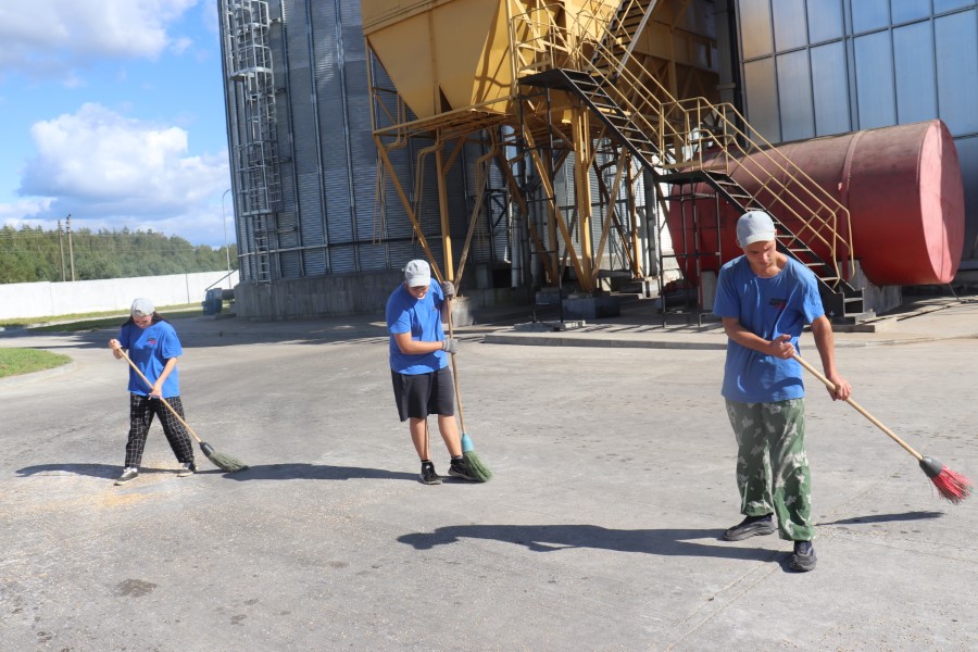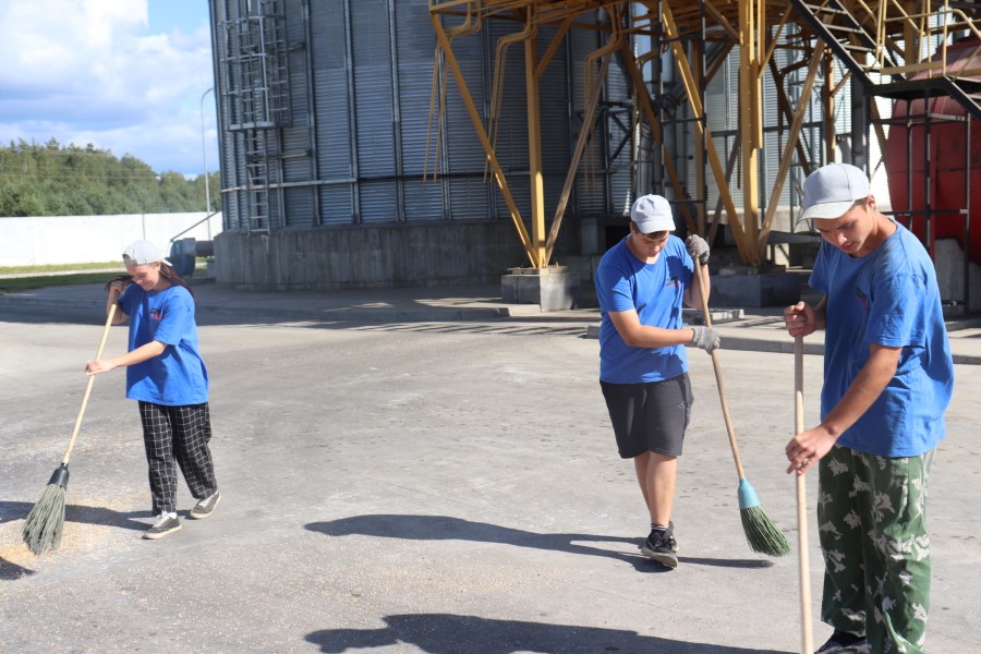 Здесь же, среди огромных гор доставленного с полей зерна, видим несколько ребят-подростков с метлами. Это ученики местной Любушанской школы Станислав Павлович, Карина Коток и Андрей Корниенко. Отработав смену в студотряде, а она началась 18 июля, многие старшеклассники решили и дальше оказывать помощь родному хозяйству. Таких сегодня 13 человек. Работают они в две смены по четыре часа. Без дела не сидят и сами, без дополнительных указаний и распоряжений, видят где именно нужно их участие. Их основная задача – вовремя смести просыпавшиеся зерна и поддерживать идеальную чистоту площадки. ПО словам старших товарищей, со своей задачей ребята справляются хорошо и не имеют нареканий.