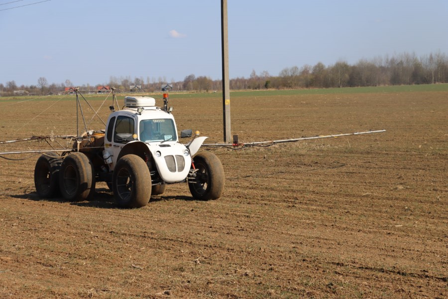 На полях вносит удобрения "Роса". Она позволяет колесить по переувлажненной земле, при этом не повреждая посевы, не оставляя на них колеи. Благодаря мягким колесам, техника быстро идет по посевам. Работа движется без простоев. На поле стоит трактор с бочкой в которой находится КАС, по мере необходимости заправщик заправляет удобрения в опрыскиватель.