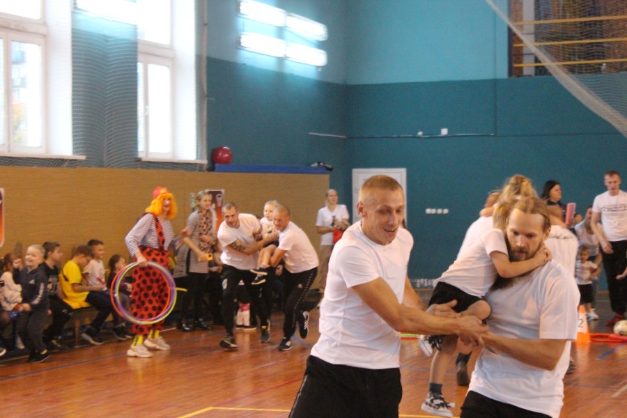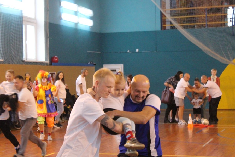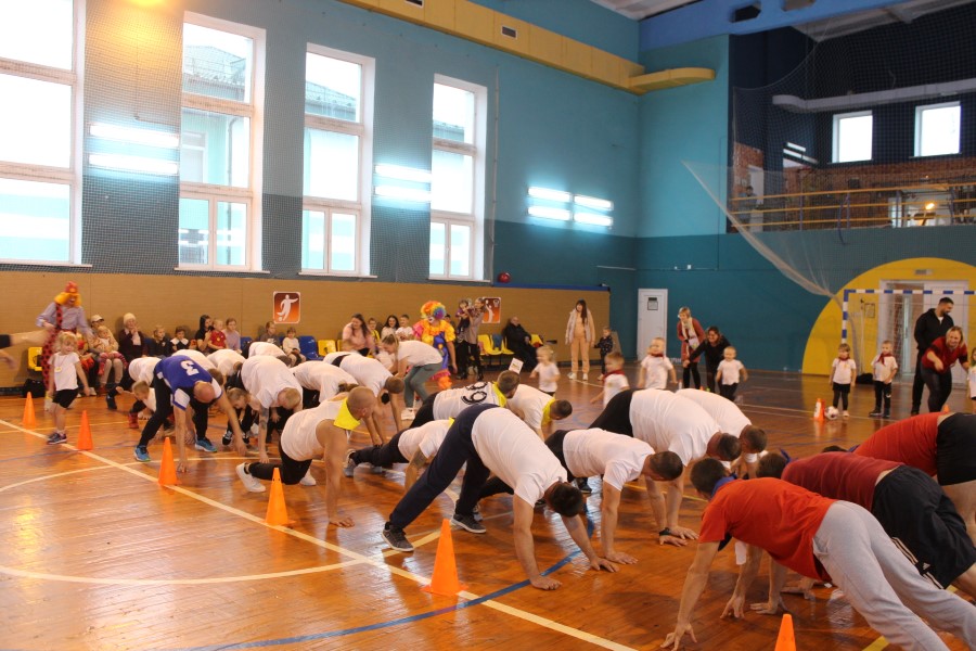 И они, эти соревнования, действительно были озорными, веселыми, подвижными и зажигательными. Папы и их дети не только вместе бегали и прыгали на время, участвовали в эстафетах, но и проявляли свою смекалку в составлении названия праздника из разрозненных букв. Добавляли позитивного настроения и два веселых клоуна. Они заводили малышей, отправлялись с ними в «путешествие», забавляли взрослых и показывали личным примером каким именно образом нужно выполнять то или иное задание.