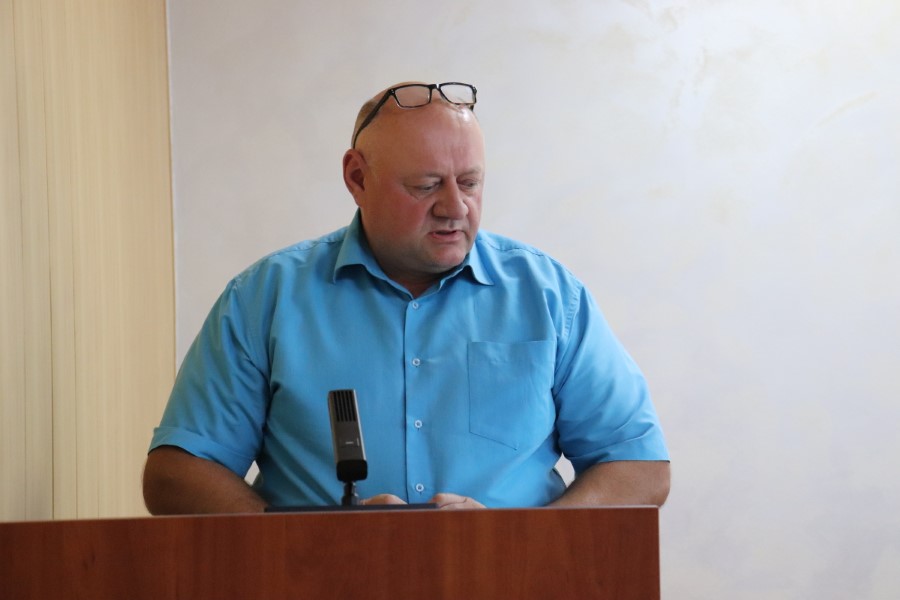 С докладом на тему "Организационные и практические мероприятия по обеспечению пожарной безопасности в сельскохозяйственных организациях при проведении уборочной кампании 2023 года" выступил заместитель начальника Березинского РОЧС Александр Лагун.