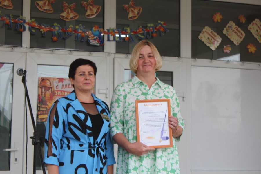 Выступление-обращение директора школы Елены Абазовик к педагогам, детям, родителям и шефам, которые помогли провести в летний период ремонт здания, также не обошлось без сюрприза: учителю белорусского языка и литературы Галине Яблонской она вручила благодарность управления по образованию, спорту и туризму райисполкома.