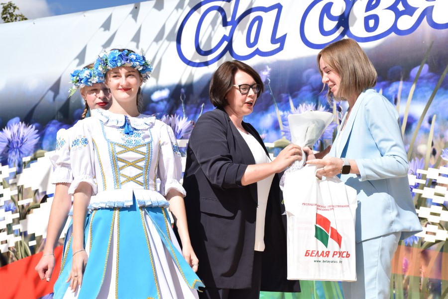 Для поздравления и вручения наград от общественного объединения и березинского отделения партии «Белая Русь» на сцену была приглашена Елена Желудева. Награды она вручила главному бухгалетру ОАО «Погостский» Екатерине Теляк, инженеру по материально-техническому обеспечению ОАО «Погостский» Геннадию Уласовцу, заведующей складом ОАО «Первомайский» Ларисе Пенкрат.
