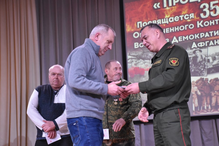 Приятный момент чествования ветеранов боевых действий на этом не был завершен. Заместитель военного комиссара по территориальной обороне Березинского района подполковник Вадим Станкевич вручил в соответствии с Указом №403 Президента Республики Беларусь от 19 декабря 2023 года юбилейные медали «35 лет вывода советский войск из Афганистана» нашим землякам – Андрею Гурину, Николаю Гамезо, Леониду Ванкевичу, Эдуарду Беркину, Василию Дыбалю, Александру Кравцову, Александру Мельничонку и Василию Федорову.