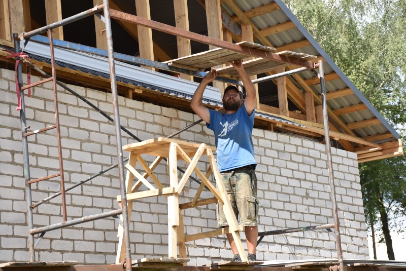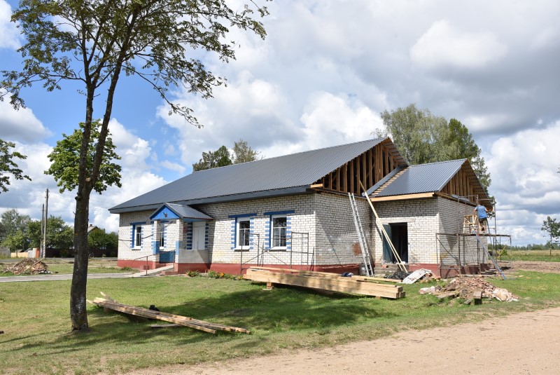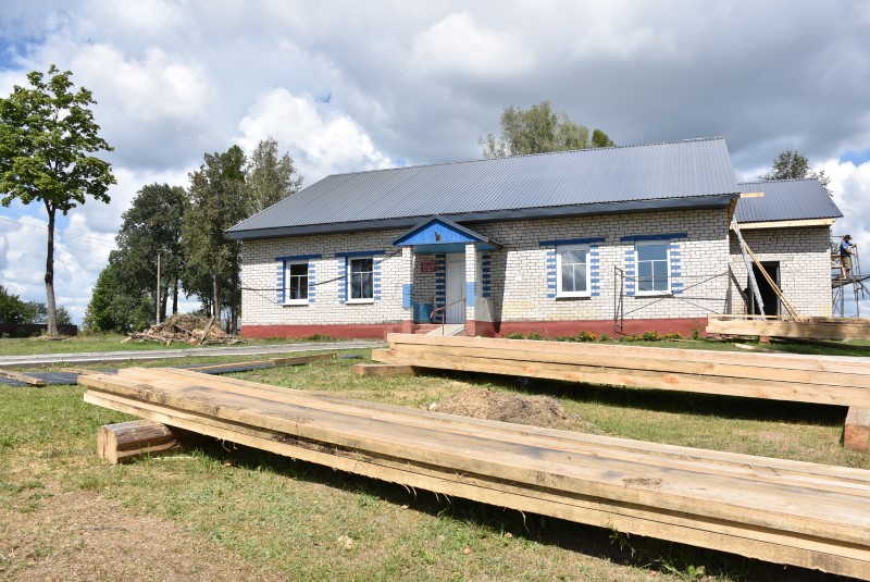 Приближаемся к сельскому Дому культуры. Несмотря на то, что он уже успел изрядно преобразиться, работы по его благоустройству продолжаются. Видно это и по тому строительному материалу, который находится рядом, и по тем работам, что ведутся этими днями. Аккуратно зашивается фронтон на поменявшей кровлю крыше, благоустраивается прилегающая к зданию территория.