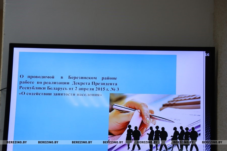 Декрет Президента Республики Беларусь № 3 «О содействии занятости населения» направлен на стимулирование трудовой занятости и самозанятости не работающих граждан. Для реализации задач Декрета в районе создана и осуществляет свою деятельность комиссия по содействию занятости населения при Березинском районном исполнительном комитете.