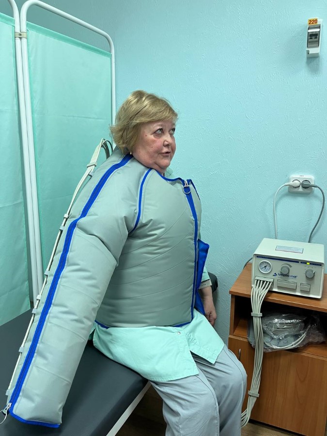 – Лимфамат – система для переменной компрессионной терапии. 12 камер манжеты попеременно заполняются воздухом до тех пор, пока в верхней камере не будет достигнуто необходимое давление. После этого давление во всех камерах одновременно падает, а через некоторое время цикл нагнетания воздуха повторяется, – рассказывает врач-реабилитолог Евгения Калистратовна Половец. – Мы ждали этот аппарат очень давно. И сегодня в нашем отделении большая радость: мы получили долгожданный, такой нужный для всех аппарат. У нас очень много больных, которые нуждаются в процедурах на лимфомате. К примеру, онкологические больные, женщины, у которых рак молочной железы, рак матки. У них после операции: отеки рук, ног. И для того, что б убрать отеки, приходилось ездить в Минск, платить деньги за процедуры. Сейчас: мы можем помочь пациентам у нас, в райбольнице и бесплатно.